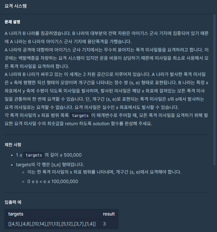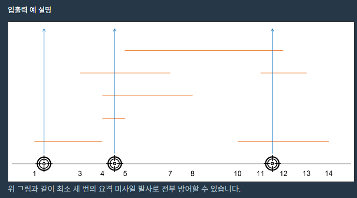 요격의 위치는 실수도 가능합니다. 그리고 주어지는 값 targets는 개구간(s부터 e까지)을 의미하며 s와 e 지점에서 요격하더라도 해당 미사일을 요격할 수 없습니다.