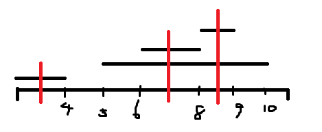 처음부터 끝 지점까지 차례대로 구간의 단절이 발생했는지를 찾아내기 위해선 모든 개구간을 시작지점 (오름차순), 끝 지점(오름차순)으로 정렬해야 합니다.