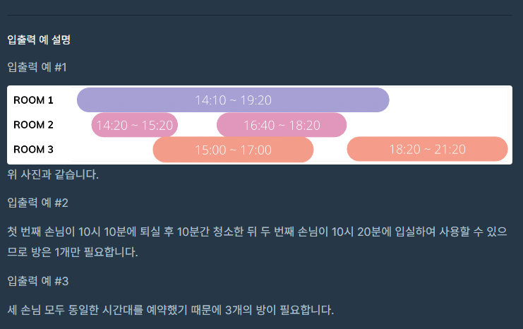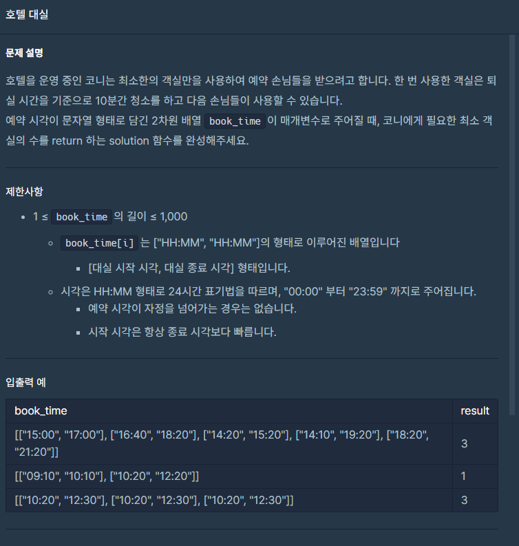 좀 무식한 접근 방식을 선택했습니다. 분을 하나의 배열 원소로 변환하고 대실 시간만큼의 범위를 카운팅합니다.