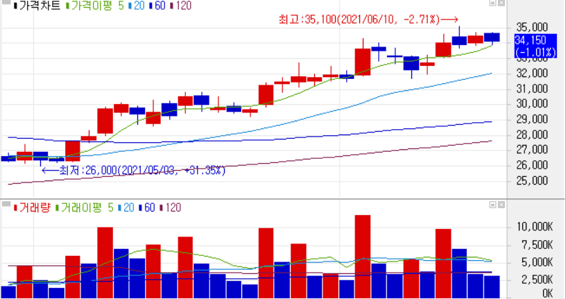 차트의 이동평균선을 보면 주가, 5일선, 20일선, 60일선, 120일선 순서대로 배열되어 있는 상태를 정배열 상태라고 하는데 앞선 기업은행과 비슷한 흐름을 가지고 있습니다. 정배열 상태에서는 주가가 각각의 단기/중기/장기이평선들의 지지를 받으며 주가의 원활한 상승을 하는 경우가 많습니다. 또한 주가가 이동평균선 위에서 파동을 그리고 있는 것으로 보아 현재 강세장임을 추측할 수 있습니다.