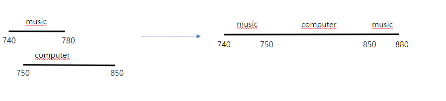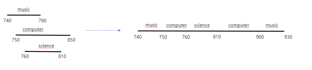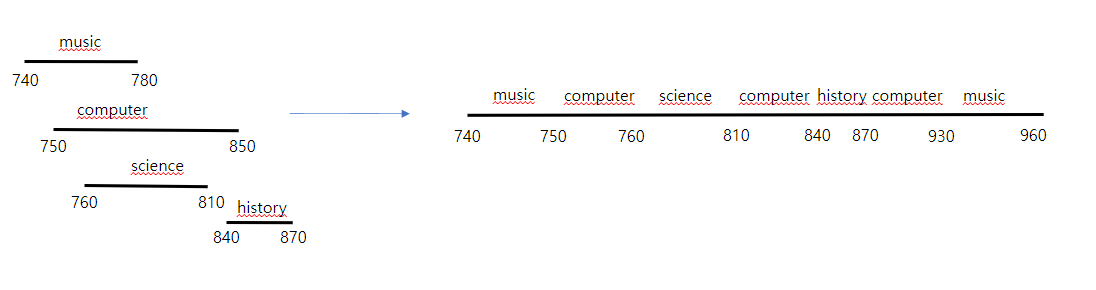 - music 은 science 과목으로 인해 시작시간이 810으로 변경됐습니다. 하지만 computer 과목을 진행해야 되기 때문에 computer 과목이 끝날 때까지 기다려야 합니다. 상식대로라면 music 은 computer 가 끝나는 시점인 900에 시작해서 남은 30분을 소요하도록 시간이 변경되어야 하지만 중요한 건 끝나는 시점이기 때문에 영 향은 없습니다.