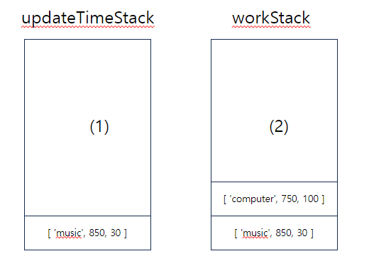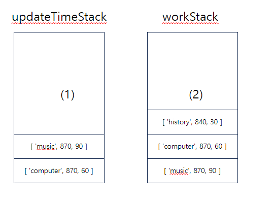 처음 반복문 (i===1) 일 땐 주어진 과제 computer의 시작시간(750)이 music의 끝나는 시간(780) 보다 작기 때문에 새로운 과제 computer를 시작합니다. 아직 music 이 끝난 게 아니니 workStack에 다시 쌓아야 겠죠. 하지만, music은 computer 과제를 시작하기 전까지 10분동안 진행을 했고, 30분이 남았습니다. 다시 music 을 시작하는 시점은 computer 가 끝나는 시점인 850이 됩니다. 따라서 시간을 변경해주어야 합니다. Solution함수의 주석 중 (1) 번이 위 그림에서 (1)을 나타냅니다. updateTimeStack 변환된 시간을 담고 다시 workStack 에 쌓아줍니다.