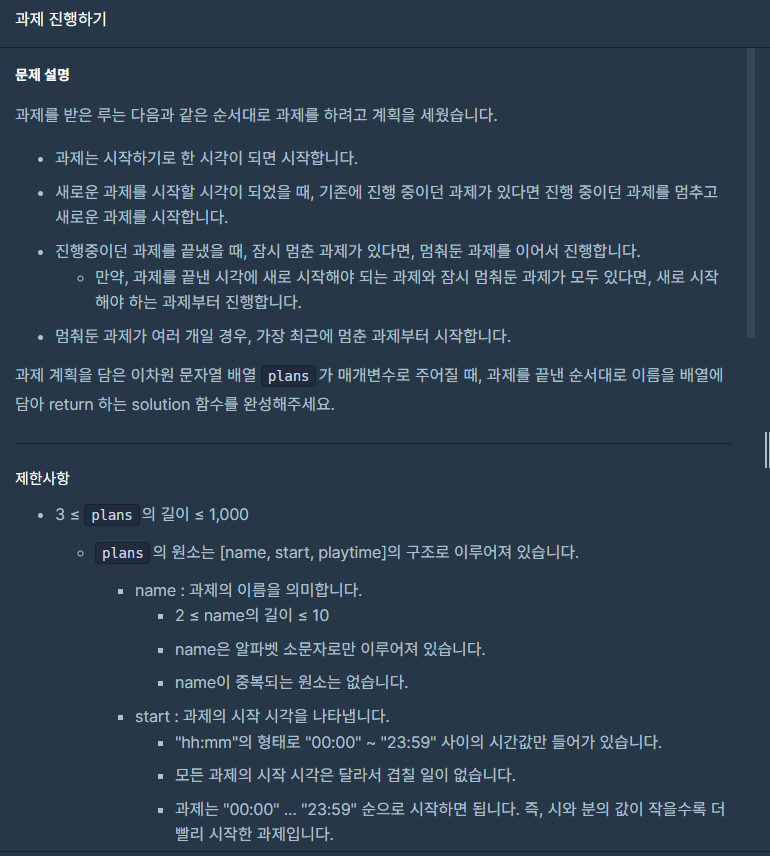 [["science", "12:40", "50"], ["music", "12:20", "40"], ["history", "14:00", "30"], ["computer", "12:30", "100"]] //시간 순으로 정렬하면 [["music", "12:20", "40"],["computer", "12:30", "100"],["science", "12:40", "50"],["history", "14:00", "30"]]