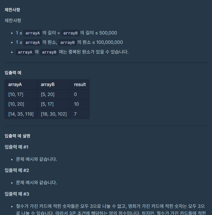 각 배열의 최대 공약수를 구했더라도 문제에서 나온 조건에 맞아야 합니다. 다른 배열의 원소들이 한 배열의 최대공약수로 나눠지면 안 됩니다. 이 조건을 구현하기 위해 isAGcdOk와 isBGcdOk라는 변수를 활용했습니다. 변수 이름을 보면 딱 알 수 있습니다. 이게 true 면 arrayA의 최대공약수가 조건을 만족시킨 거구나 알 수 있죠.