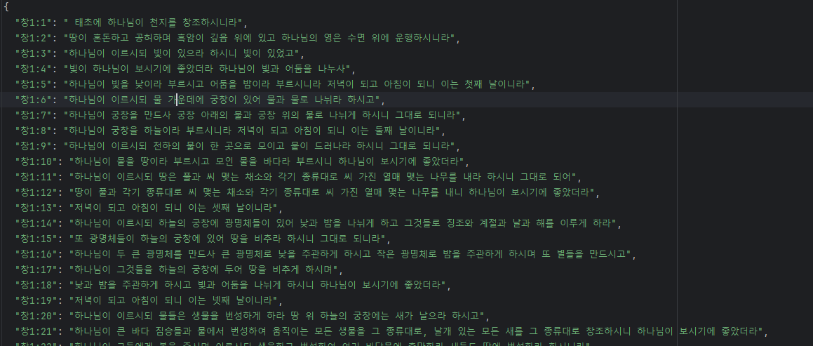 그래서 txt파일로 다운받아 JSON 으로 변환했습니다. JSON 으로 변환한 성경 파일을 공유합니다.