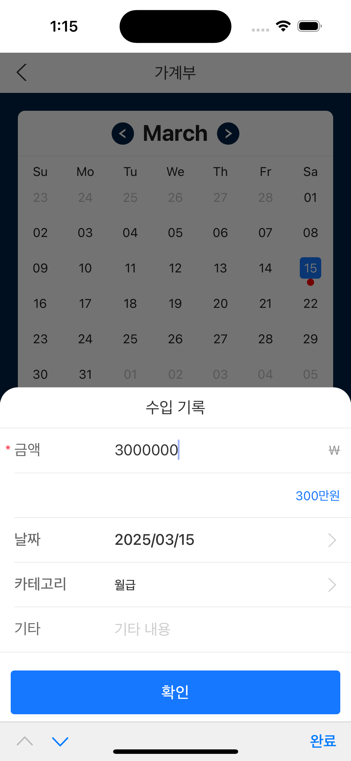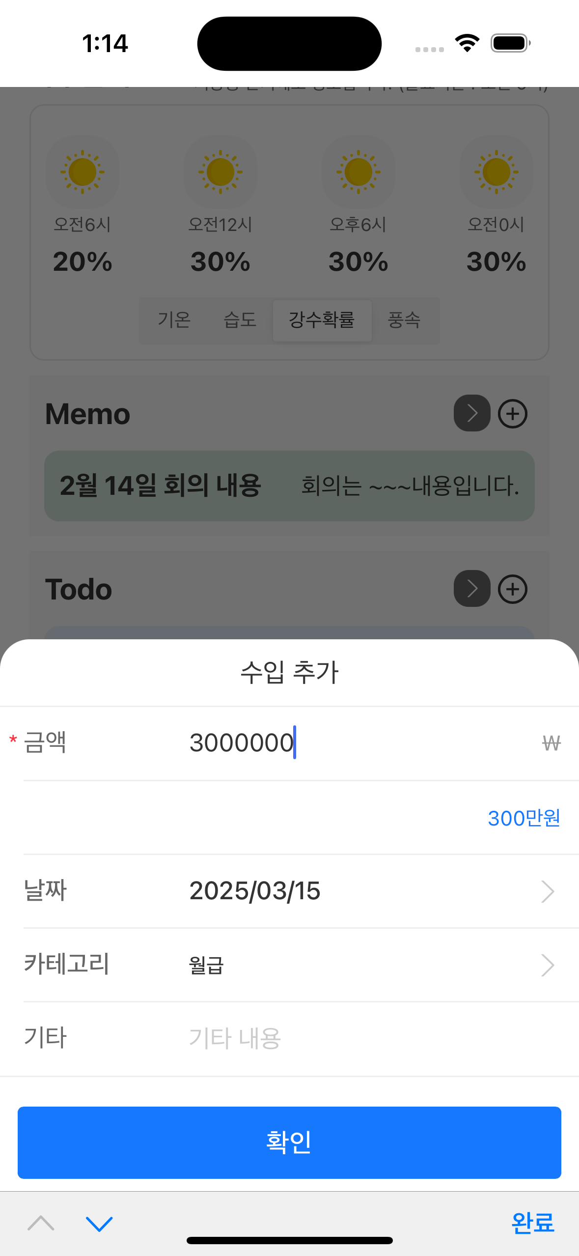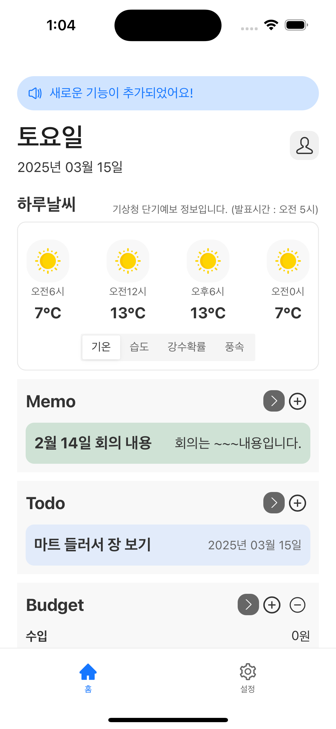 홈에서는 모든 기능을 한 눈에 볼 수 있습니다. 날씨와 일정, 메모, 가계부를 한 눈에 확인할 수 있습니다.