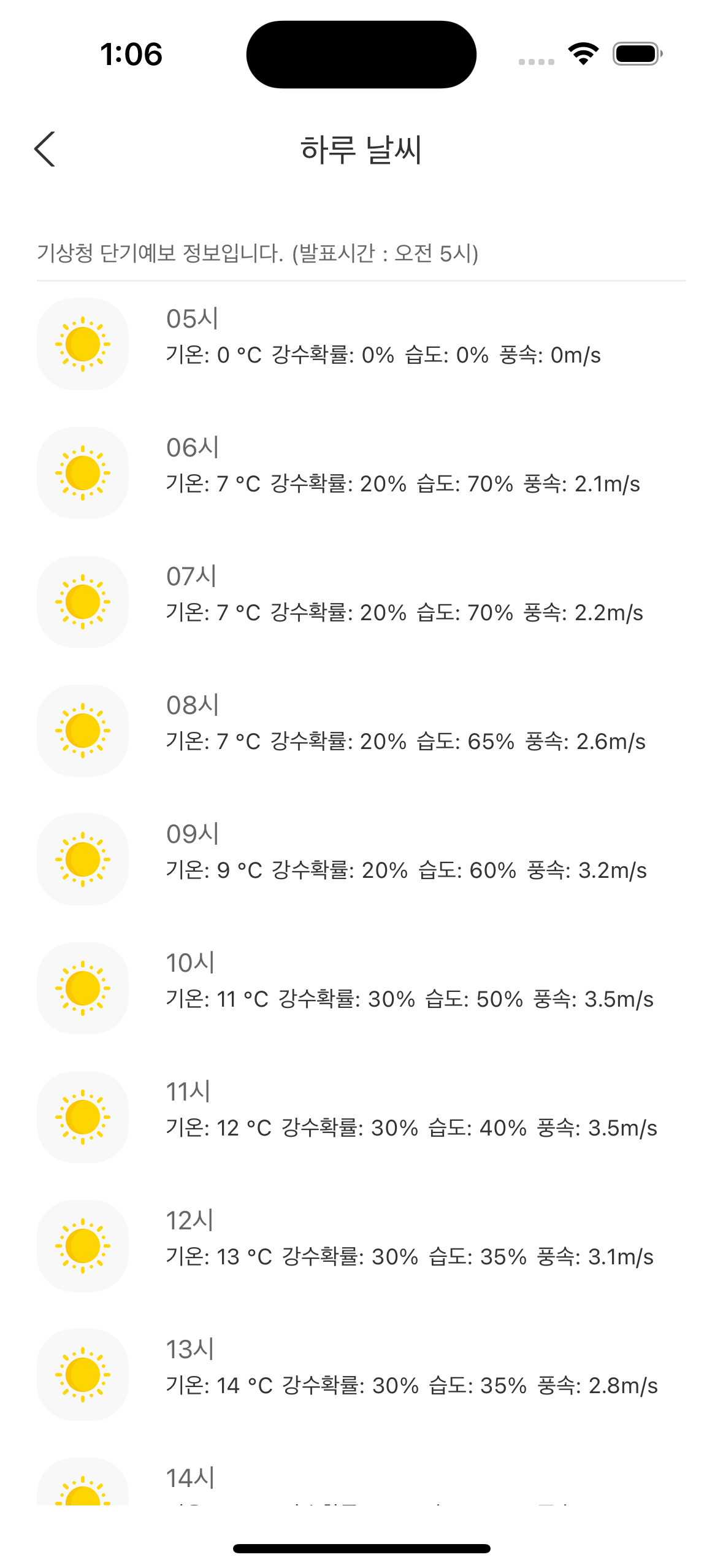 기상청 단기예보 정보를 공공데이터포털 API로 조회해 하루의 날씨를 크게 네 시간으로 나누고 기온, 습도, 강수확률, 풍속 정보를 보여줍니다. 하루날씨 카드 터치를 통해 더 자세한 날씨 상황을 확인할 수 있습니다.