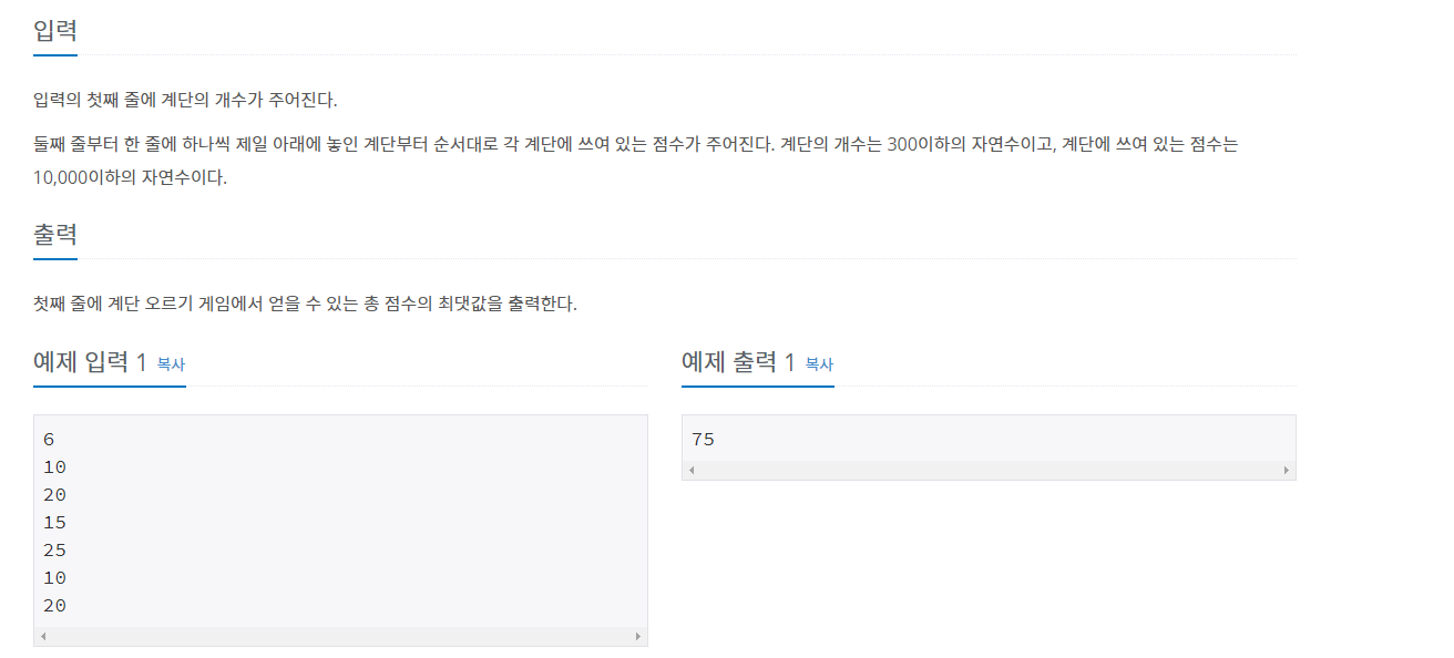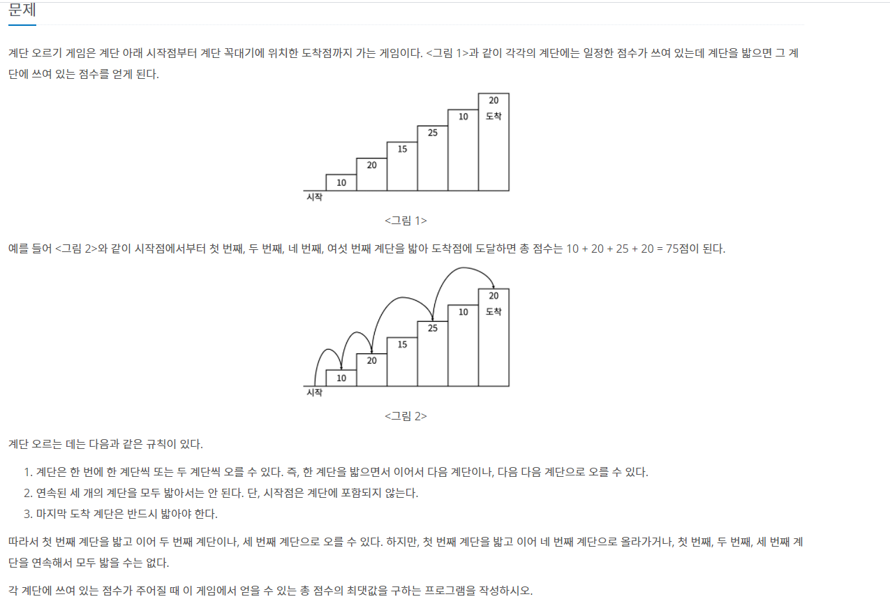 계단 오르기 문제는 정답 비율이 35% 정도 되는 어려운 문제였다. 꽤나 까다롭고 예상치 못한 부분이 있어서 2일 정도 계속 고민했던 것 같다. 이전 정수 삼각형 문제와 같이 마지막 계단으로 가는데 누적합이 최대가 되는 경로를 찾아 그 최대 누적합을 출력하는 문제이다. 동적 계획법 문제들이 그렇듯 메모이제이션과 점화식을 잘 찾아내면 해결할 수 있지만 이번 포스팅에선 내가 실패했던 케이스와 이를 해결한 과정을 기록하고자 한다.