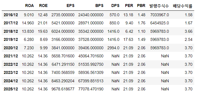 df.loc['202'+str(i)+'/12'] = [df['ROA'].mean(),ROE_mean,new_eps,new_bps, np.nan, PER, PBR, np.nan, stock_ret]