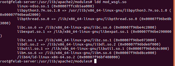 ldd /usr/lib/apache2/modules/mod_wsgi.so