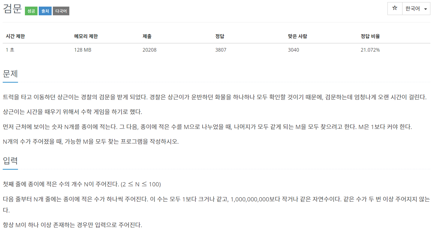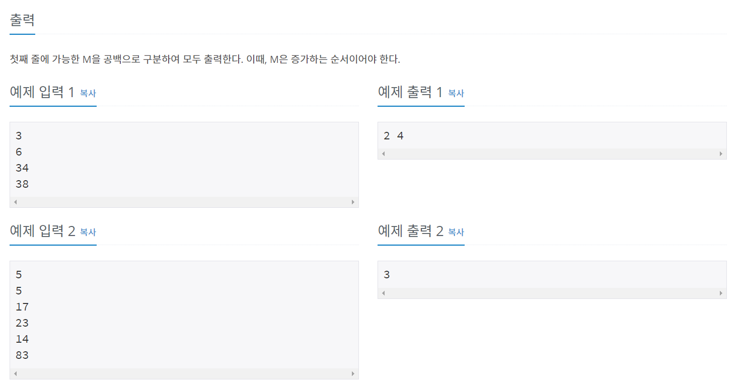 만약 N=3 이고 2, 12, 18 가 주어진다면 M은 2 뿐이다. 2와 12의 차이는 10이고 18과 12의 차이는 6이기 때문에 10과 6의 최대 공약수는 2이고 최대 공약수의 약수 중 1을 제외하면 2만 남는다.