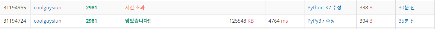 +같은 알고리즘을 가지고 파이썬으로도 구현해보았는데 역시나,, python3는 시간 초과를 뱉고 Pypy3는 통과를 하였다.