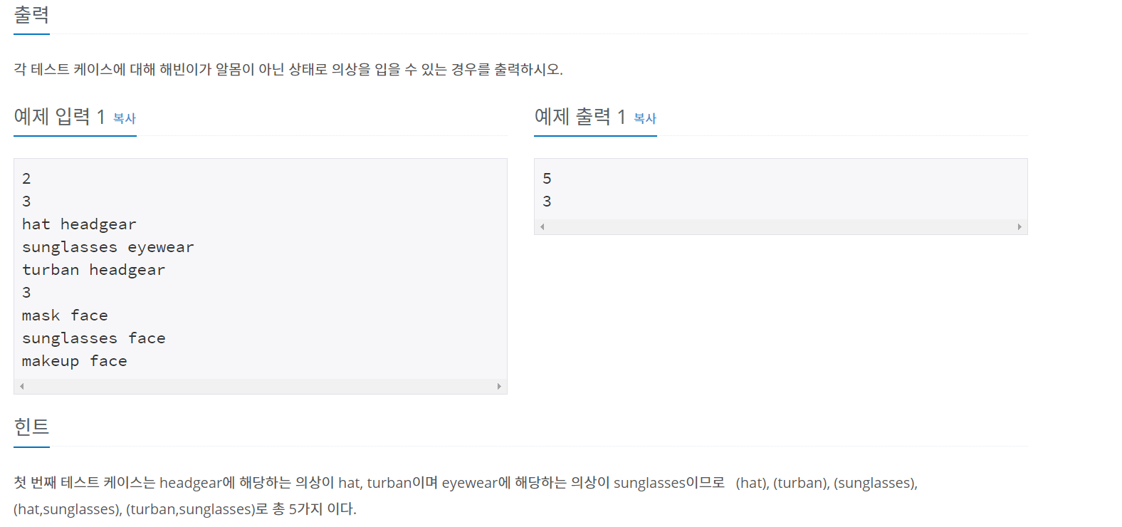 예제 입력 1의 첫 번째 테스트 케이스의 경우 headgear = [hat, turban] , eyewear = [sunglasses]가 있는데 옷 종류 중에 하나만 입어도 된다. 즉, headgear 중 한 개를 입었으면 eyewear를 입지 않아도 된다.