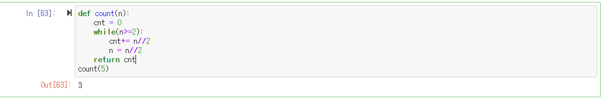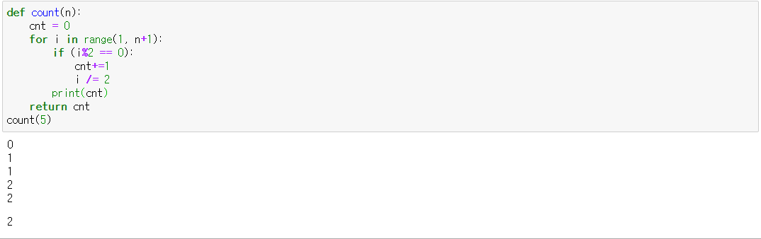 반복문을 1부터 5까지 돌며 2로 나누어지는 수가 있으면 그 수가 1이 될 때까지 2로 나누어주고 나누어 줄 때마다 카운트를 올린다.