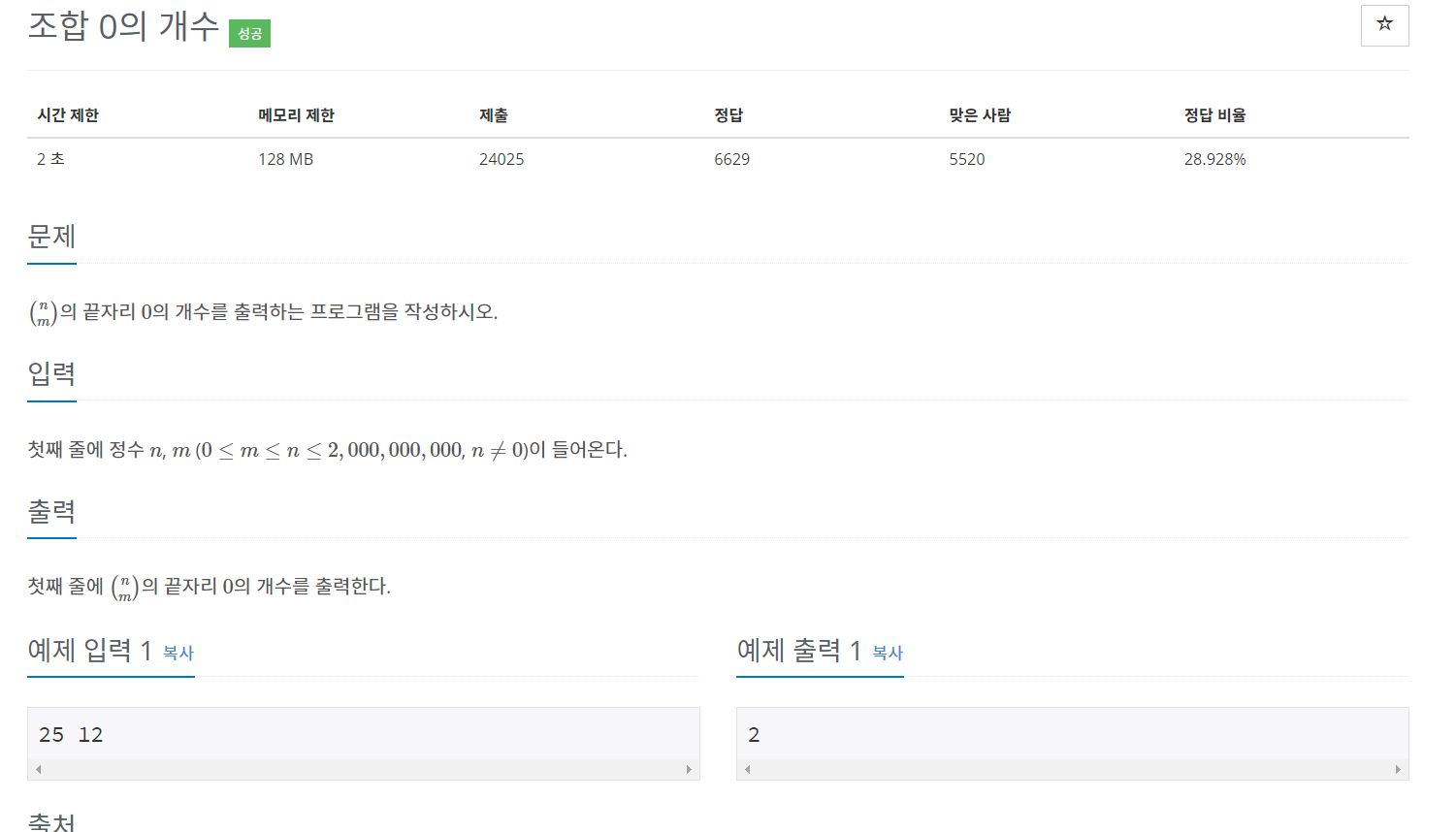이항 계수에서 0의 개수를 구하는 것인데 이항 계수는 $ \frac{n!}{{n-r!} \times r! } $ 이므로