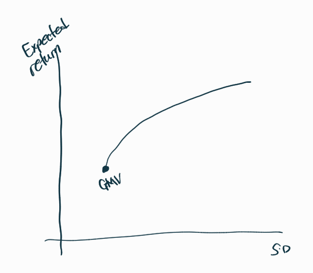 분산(위험도)을 최소화하는 공식을 통해 수익률을 높여가며 표준편차가 최소인 지점을 찍어 이으면 위 그림처럼 곡선이 생깁니다. GMV는 Global Minimum Variance 포트폴리오로 표준편차가 가장 작은 포트폴리오입니다. 즉, 가장 안전한 포트폴리오라는 것이죠.