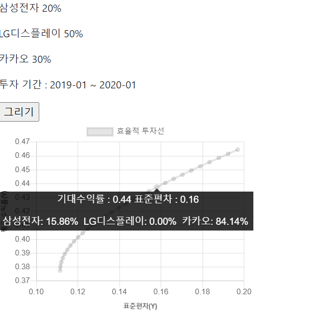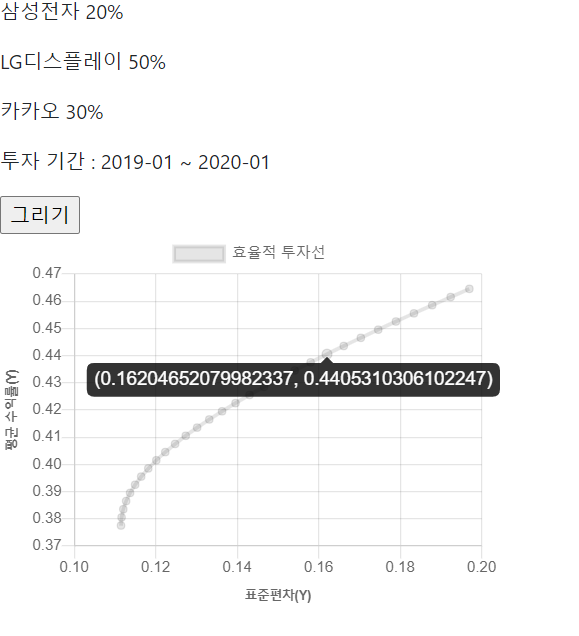 지금까지 백엔드에서 최적화 과정을 통해 사용자의 포트폴리오, 효율적 투자선, GMV 포트폴리오 등을 산출해서 프런트엔드로 값을 가져왔습니다.
