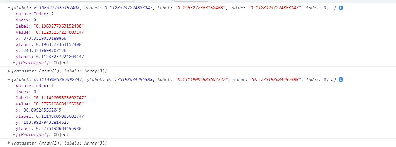 첫 번째 출력 결과는 User 포트폴리오 점을 찍었을 때고 두 번째 출력 결과는 GMV 포트폴리오를 찍었을 경우입니다. 보다시피 datasetIndex 가 다른 것을 볼 수 있습니다. 이 datasetIndex 값으로 차트에서 구분해줘야 합니다. 만약 datasetIndex가 2이면 GMV 포트폴리오에 대한 툴팁을 보여줘라 이런 식으로 말이죠.