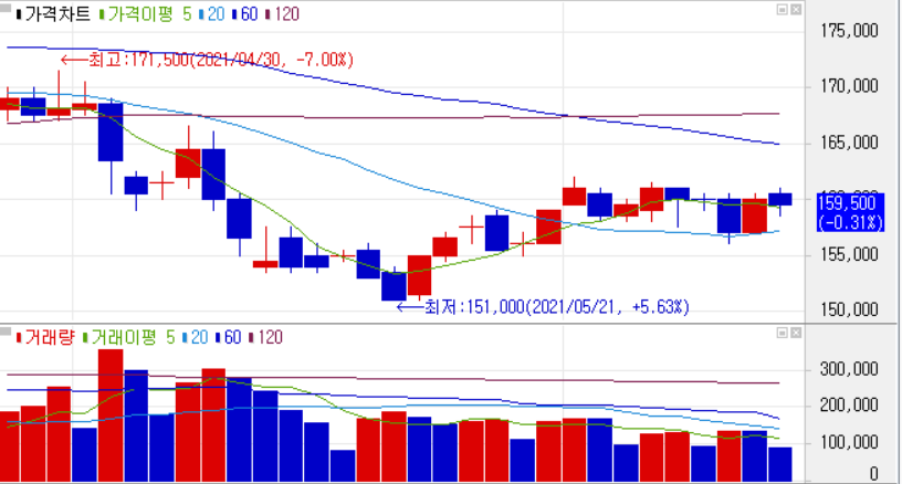 일별 이동평균선을 보면 120일, 60, 주가, 20일 선으로 역배열 상태에 가깝습니다. 역배열 초기 국면에 돌입하는 경우는 주가가 상당기간 큰폭으로 하락할 확률이 높으며 하락에서 일시적으로 상승을 시도하는 경우에도 위에 놓여있는 '이동평균선'의 저항에 부딛치며 주가의 상승을 저지하는 역할을 합니다. 현재 주가가 장기 이평선 아래에서 파동을 치고 있는 것으로 보아 하락세 혹은 횡보가 이어질 것으로 보입니다.