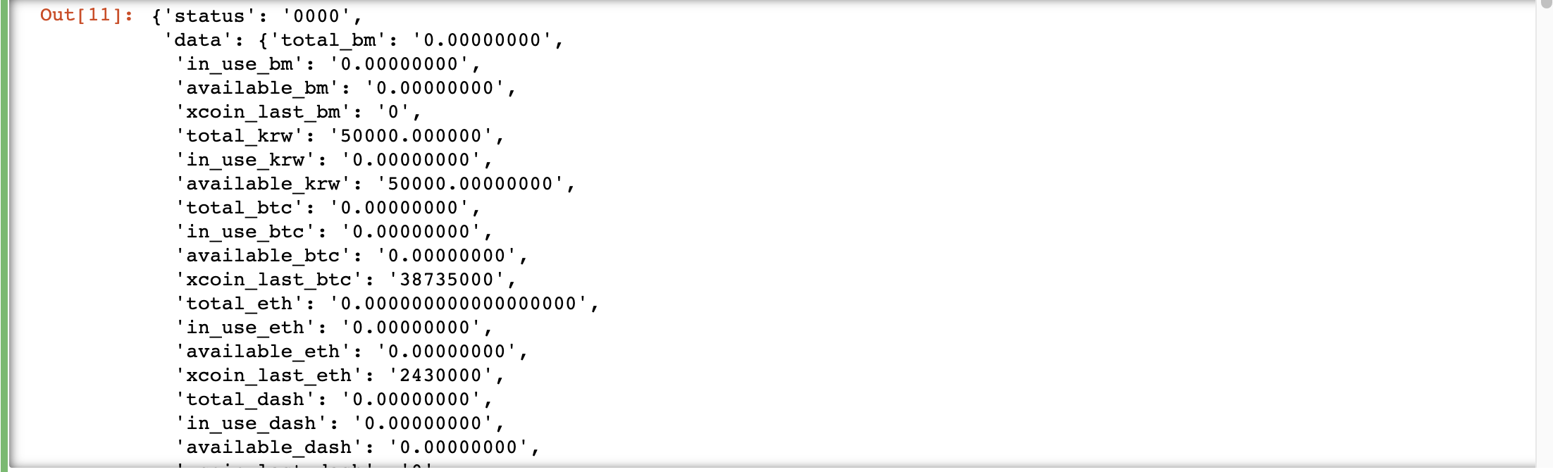 위 json에서 available_[currency] 값이 0이 아닌 애들만 필터링하면 그게 보유잔고가 될 겁니다.