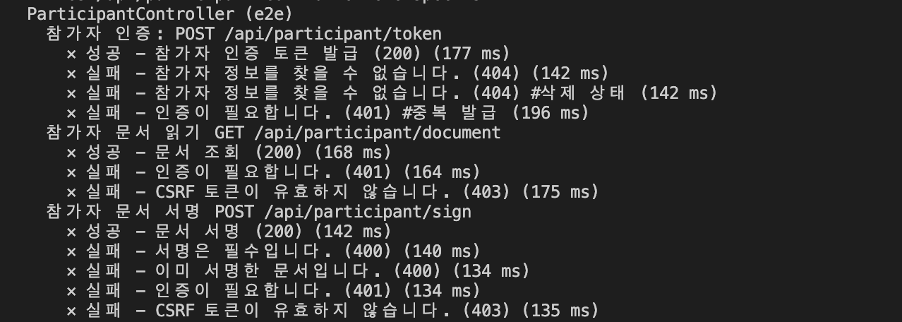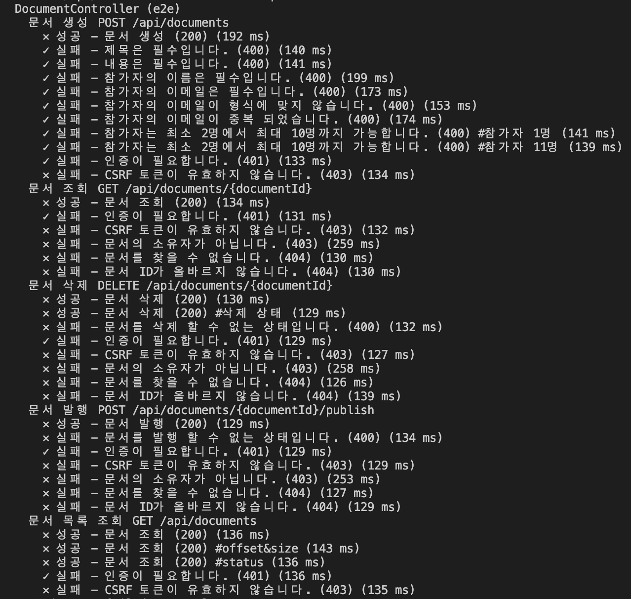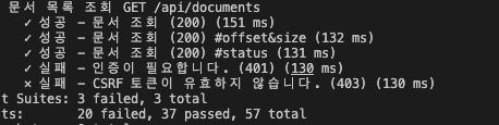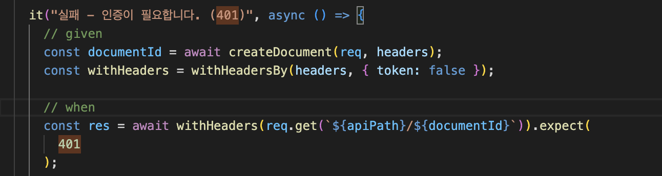 로그인 사용자용 API는 api/documents 에 한합니다. 따라서 document.controller.e2e-spec.ts에서 인증여부를 체크하는 유닛 테스트 케이스를 검색해 본 결과 총 5개입니다.