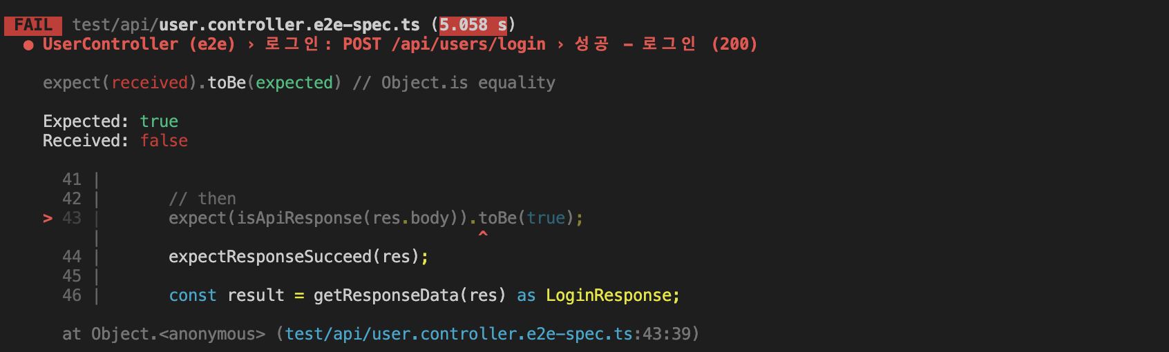 가장 먼저 진행하는 테스트를 보면 response응답에 success라는 필드가 있는지 검사합니다.