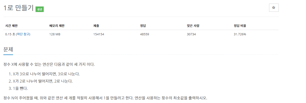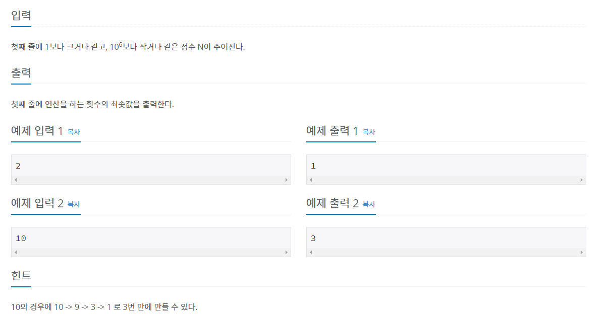 생각보다 간단하게 풀 수 있는 문제였는데 정답 비율이 낮아서 놀랐다. 동적 계획법 문제이다 보니 이 역시도 메모이제이션과 점화식만 찾아내면 문제를 풀 수 있다. 이 문제는 연산을 사용하는 횟수의 최솟값을 출력하는 문제이다 보니 메모이제이션 해야 하는 값은 주어진 N을 1로 만드는데 까지 드는 연산 횟수의 최솟값이다. N이 2로 나누어지는지 3으로 나누어지는지에 따라 다른 케이스로 나뉘며, 각 케이스마다 N을 1로 빼는 케이스가 더해져 최솟값을 비교해야 한다.