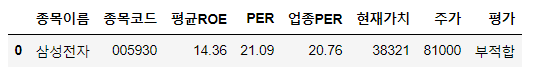 self.all_datas = pd.DataFrame(index = ['종목이름','종목코드','평균ROE','PER','업종PER','현재가치','주가','평가'],