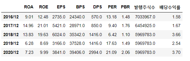 df.loc['202'+str(i)+'/12'] = [df['ROA'].mean(),ROE_mean,new_eps,new_bps, np.nan, PER, PBR, np.nan, stock_ret]
