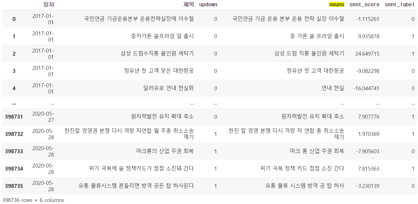 - 당일 뉴스에 등장하는 단어들의 평균 감성점수를 구하여 전체 단어들의 평균 감성점수보다 크면 1 작거나 같으면 0을 labeling
